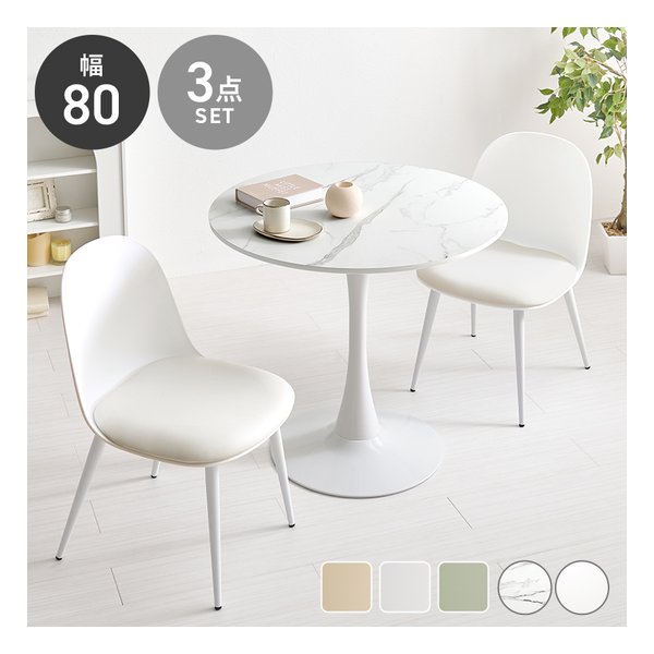 萩原 ハギハラ テーブル&チェア 3点セット テーブル直径80cm/マーブルホワイト/ホワイト BT-8659MWH-55WH-3S(2667906)
