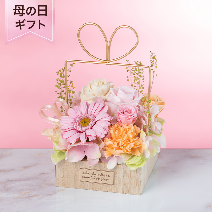 お母さんのように優しいパステルカラーのお花を集めて作った、見るたび心が癒されそうなアレンジメント。ゴールドのアイアンでリボン型を描いた、ギフトボックス風の花器が目を惹きます。