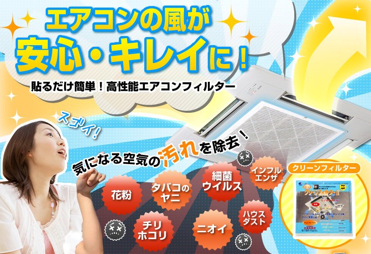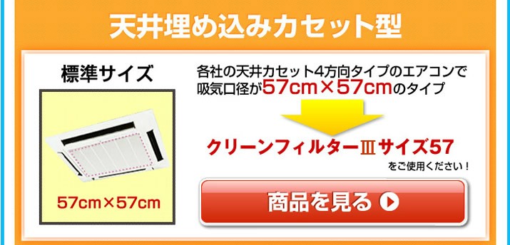 天井埋め込み型業務用エアコン(縦57×横57cm)に対応し、目詰まりしにくい設計で通気量を確保しつつ、花粉、ハウスダスト、ヤニ、ウイルスなどの見えない浮遊汚れをしっかりキャッチします。