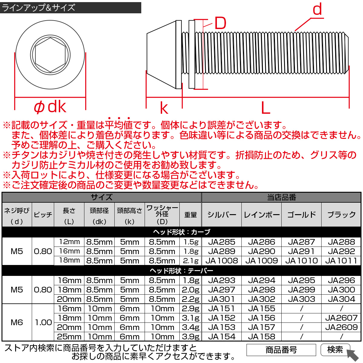 チタンボルト M6×25mm P1.00 ワッシャー組込 テーパーヘッド キャップボルト 平座金付き 六角穴付ボルト シルバー JA154