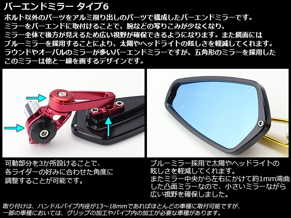 バイク バーエンドミラー 左右セット ブルーミラー ヘキサゴンタイプ アルミ削り出し ハンドルバー径13-18mm対応 4色 S-504