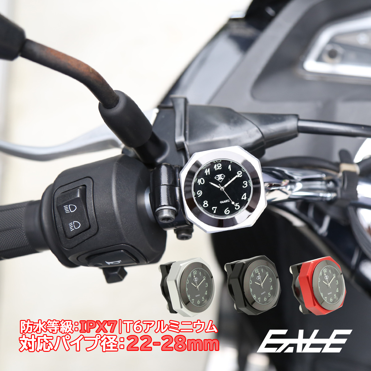 バイク用 アナログ時計 ハンドル取付ウォッチ IPX7防水 夜光 文字盤 アルミCNC削り出し 3色 S-766