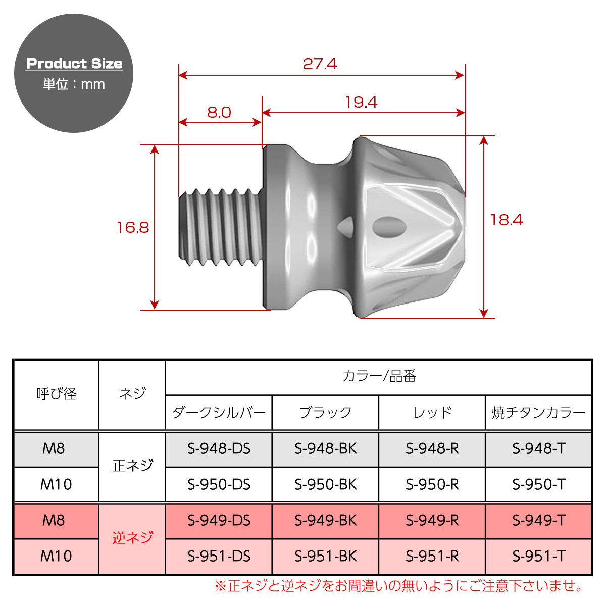 ※ピッチは全て1.25です。正ネジ、逆ネジにご注意下さい。