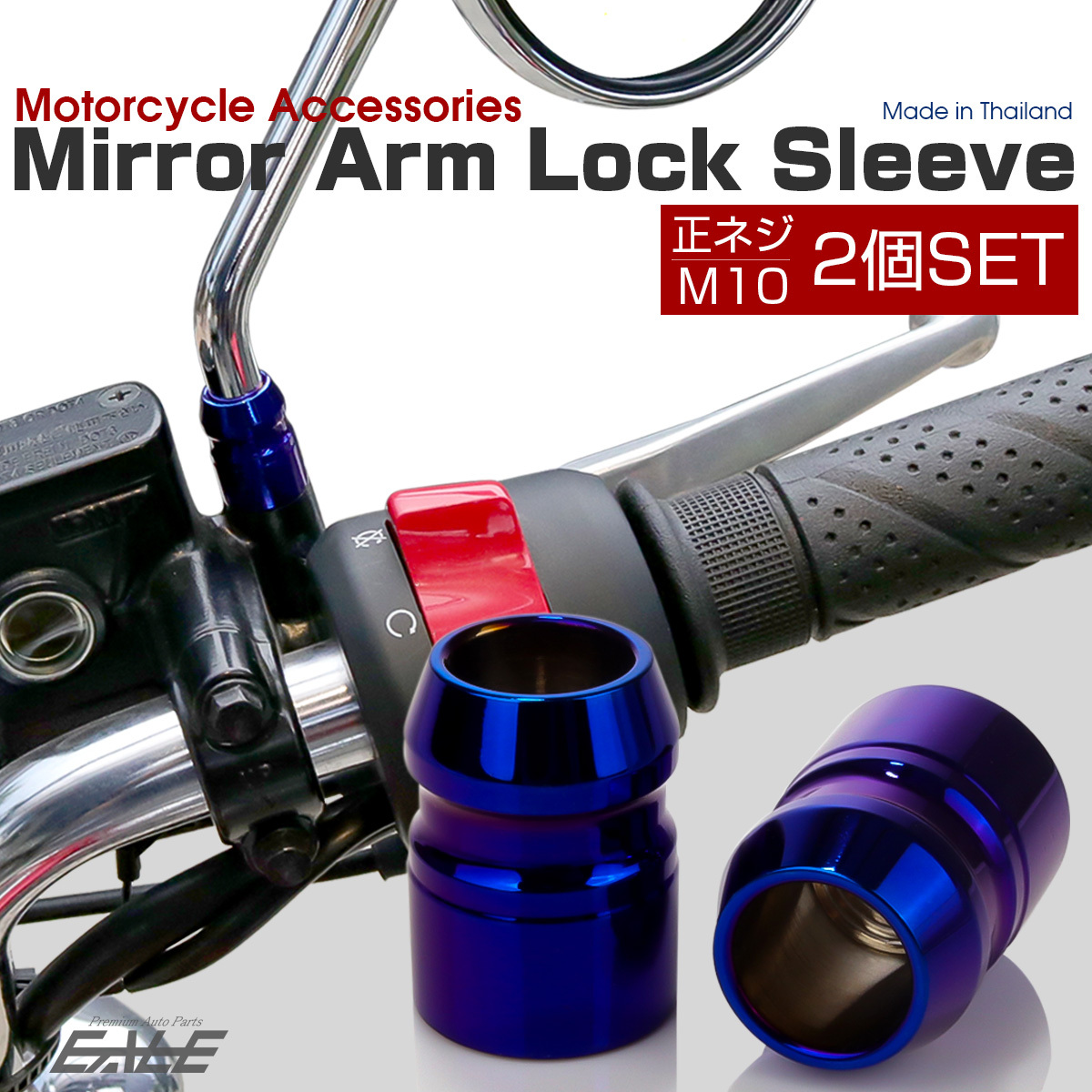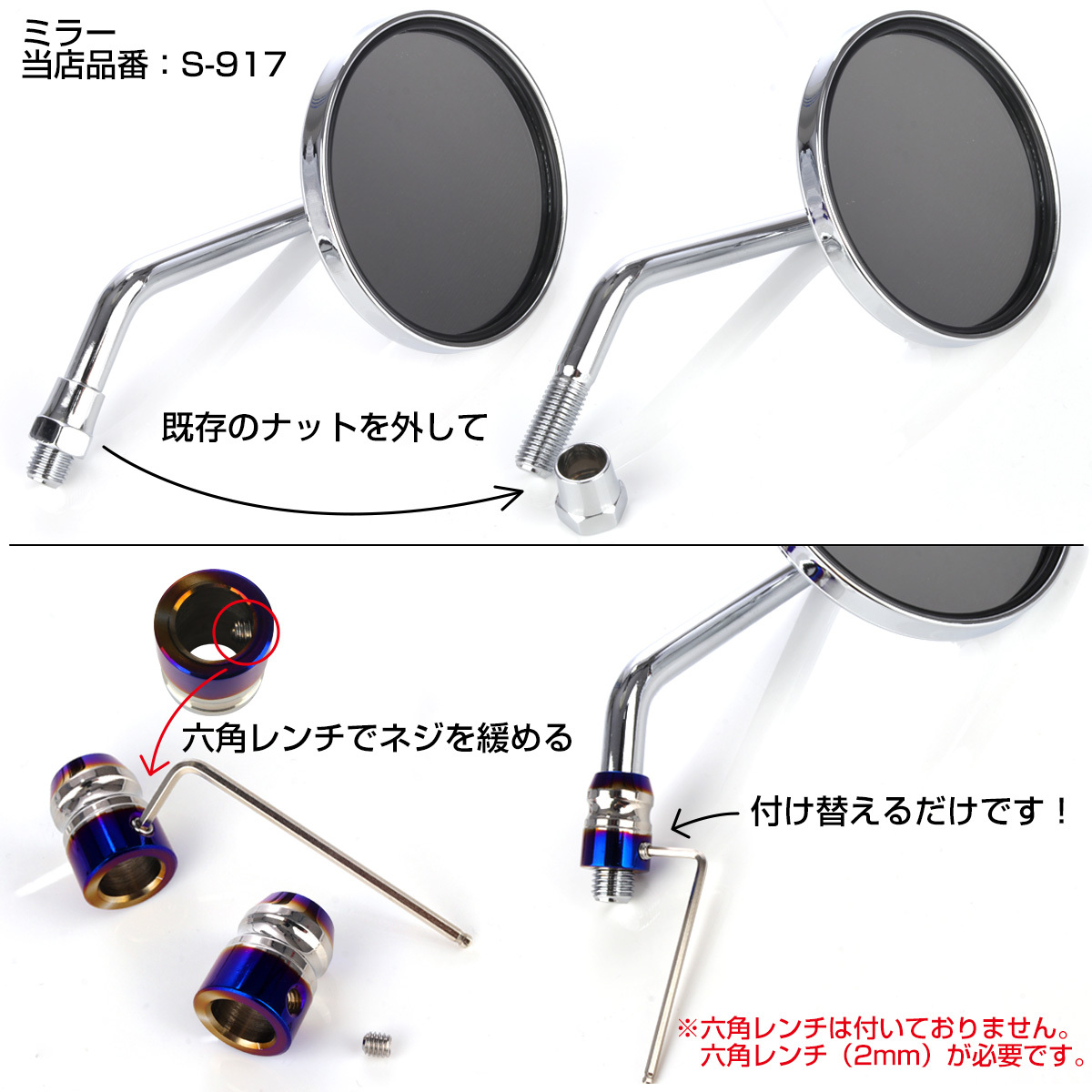 ※画像のミラー(当店品番:S-917)は、M10正ネジでアーム部分の外径が10mmのミラーになります。