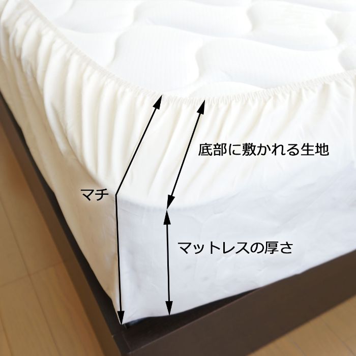 マットレスの厚さ(高さ)+底部に敷かれる生地を含めた長さです。マチ選びの目安は、マットレスの厚さプラス5~15cm程度です。