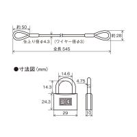 両端アイ加工のワイヤーロープと南京錠のセット品。キー3本付。シリンダー錠はNo.1200シリーズを採用。