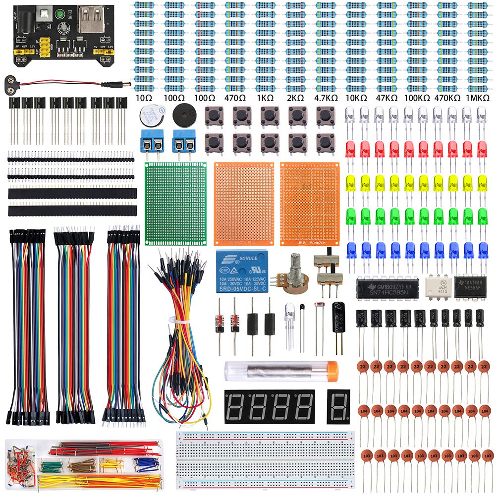 ブレッドボードをはじめ、ジャンパーワイヤー、ユニバーサル基板、デュポン線、電源モジュール、5mm LED、抵抗器、LED表示器、電解コンデンサ、セラミックコンデンサ、各種類のボタン、トランジスタなどなどの基本電子部品が揃って使い勝手がいいです
