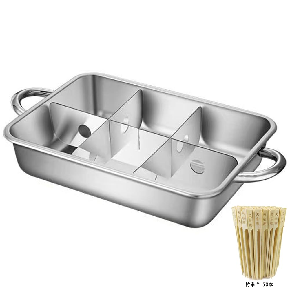 おでん鍋:6グリッド,仕切り付. IH/直火対応,竹串50本付き。仕切り取り外し可能。両手鍋デザイン,やけど防止と滑り止めハンドル、使いやすい。良質なステンレス板を採用して、丈夫で、熱の伝わりが良く、保温性に優れ。