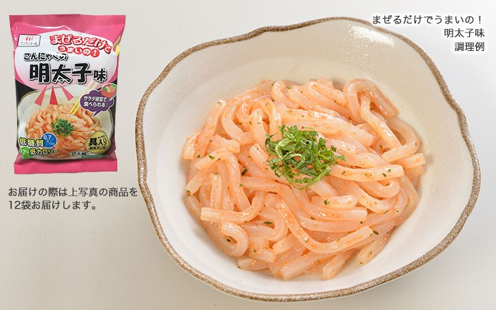 手軽に調理できるコンニャクのおかず「まぜるだけでうまいの! 」シリーズの、こんにゃくの明太子味12袋セットです。