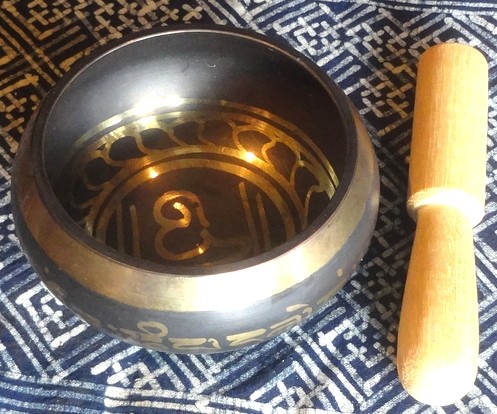 木製の棒で椀の周囲をゆっくり擦るように回すと、金属の波動が共鳴しあい、それが徐々に奥行きのある神秘的な倍音の響きとなります。