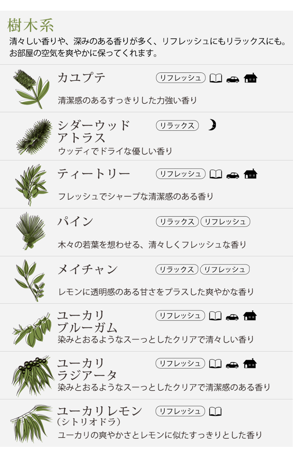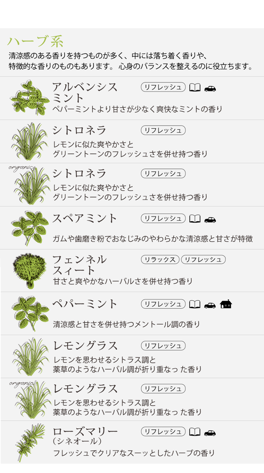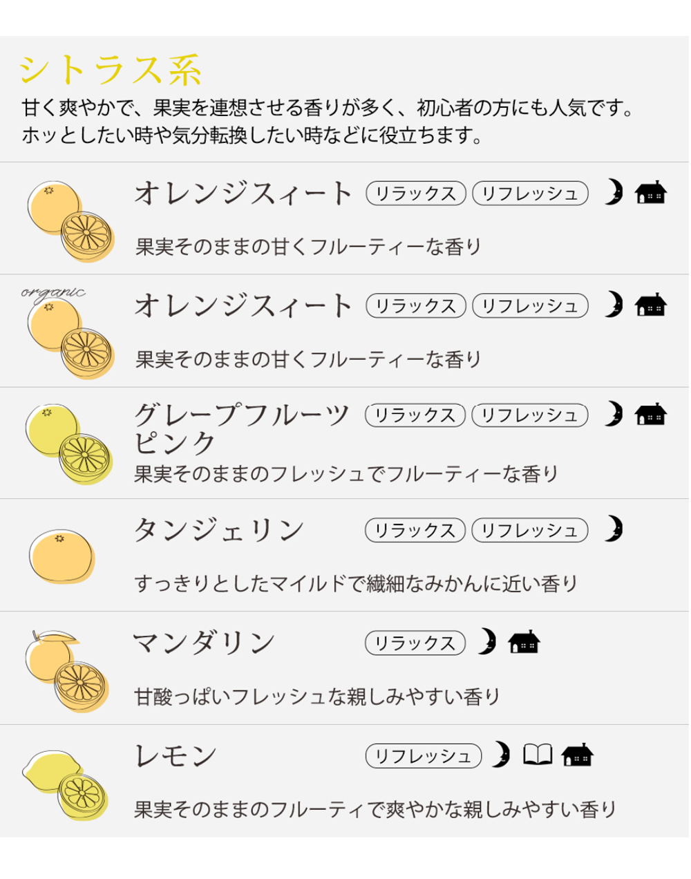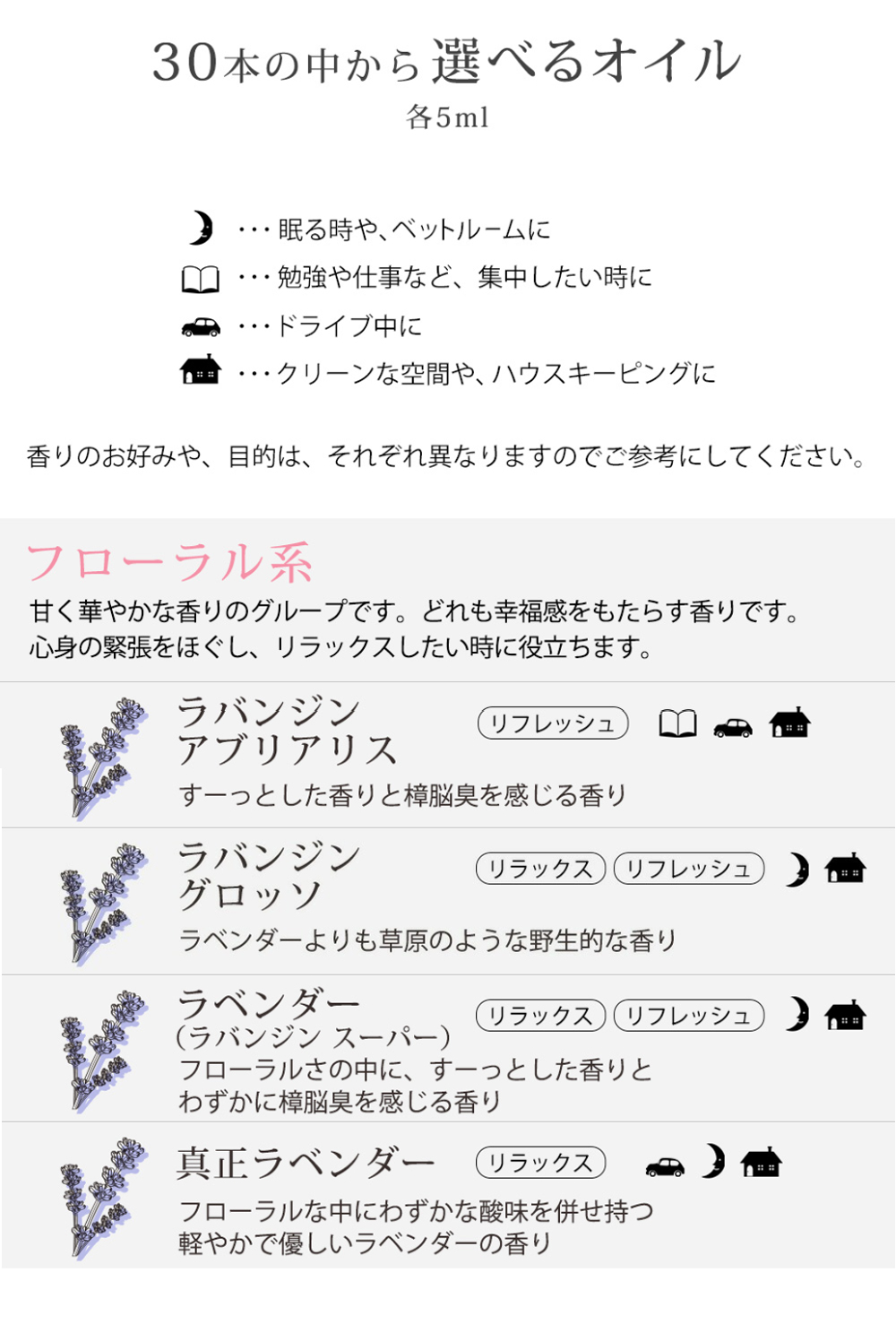 ●仕入れの状況に応じて、選べる精油が変更となる場合があります。ご迷惑をお掛けいたしますが、何卒ご了承くださいませ。