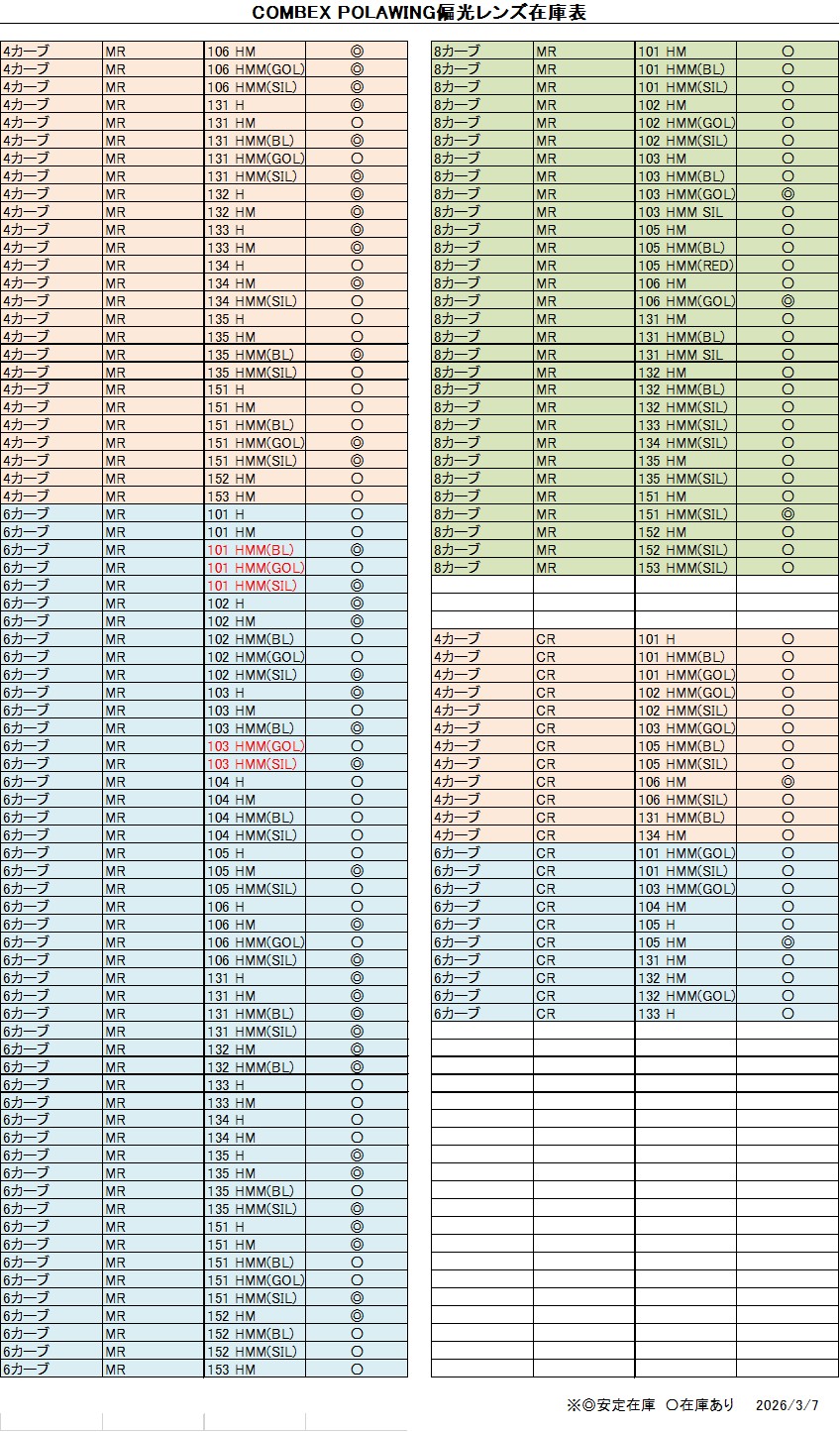 COMBEX偏光レンズセット価格H(ハード)21340円 HM(ハードマルチ)22440円 HMM(ミラー)25740円