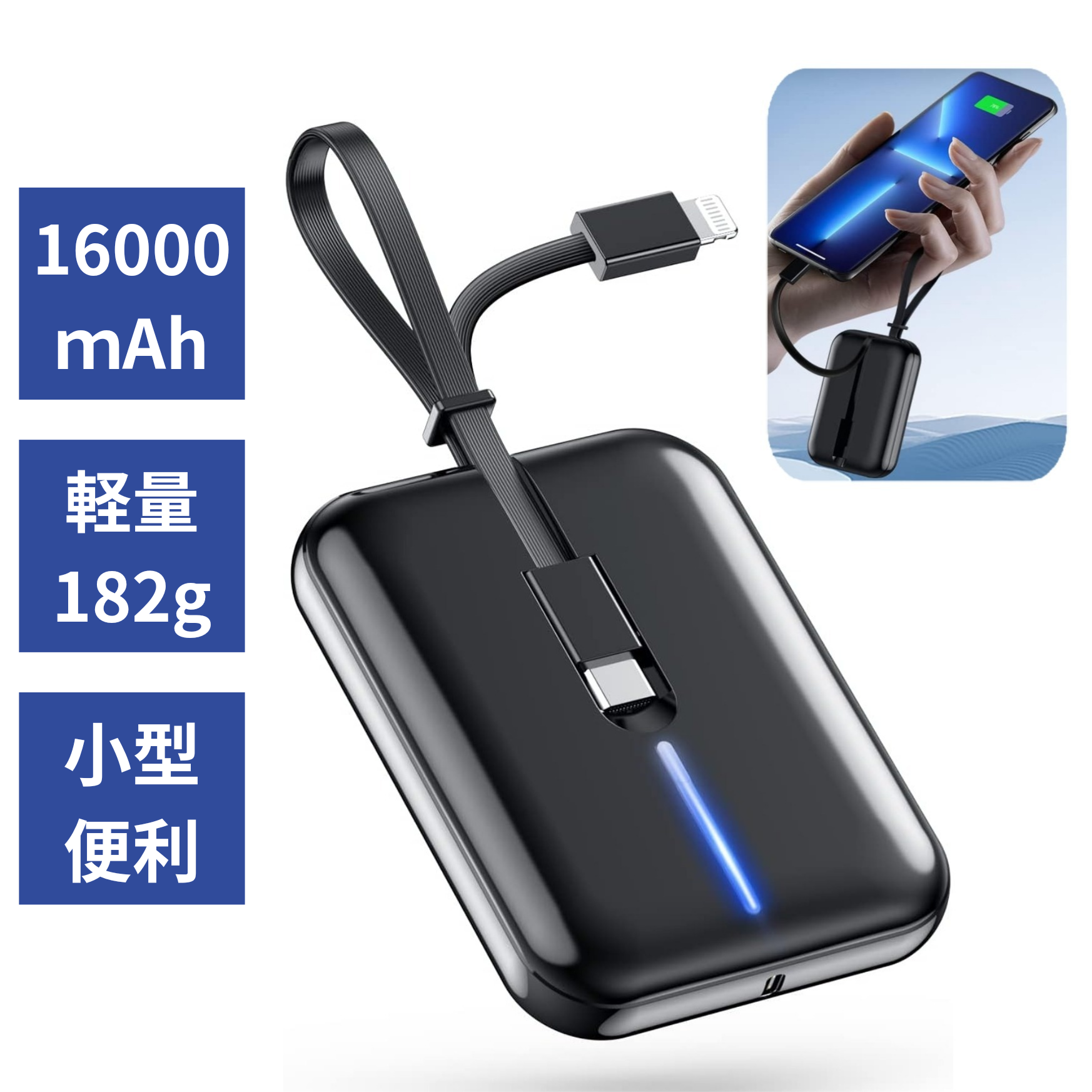 モバイルバッテリー 16000mAh 大容量 軽量 小型 急速充電(Type-C+Lightning+USB-A)ケーブル内蔵 2台同時充電 PSE技術基準適合 Type-C入力