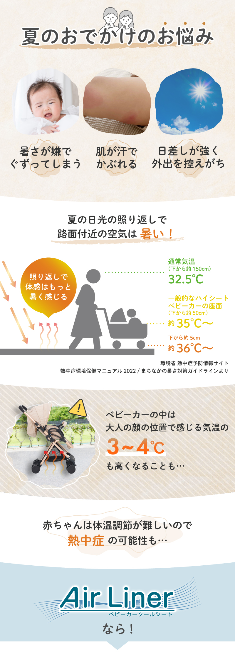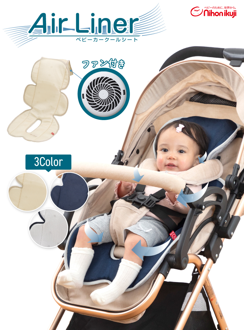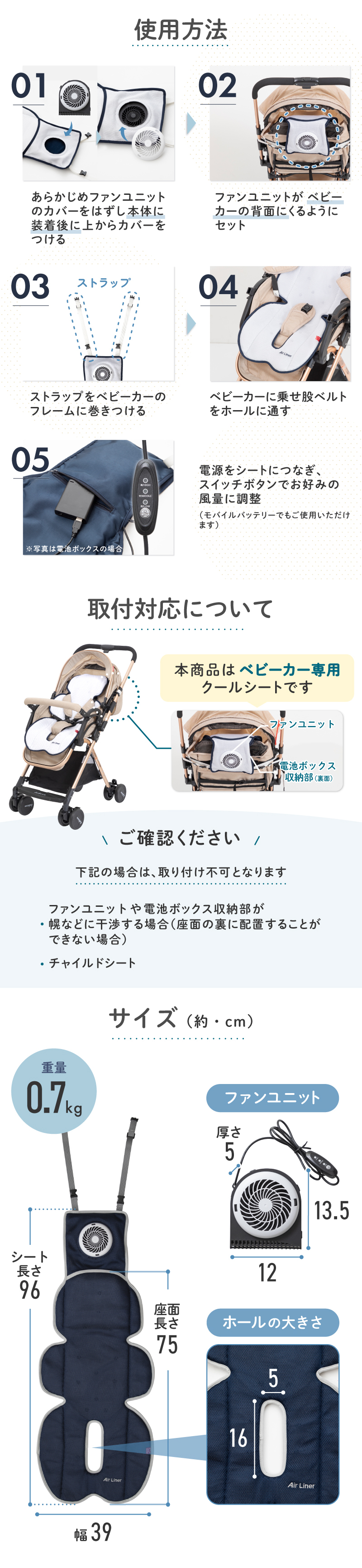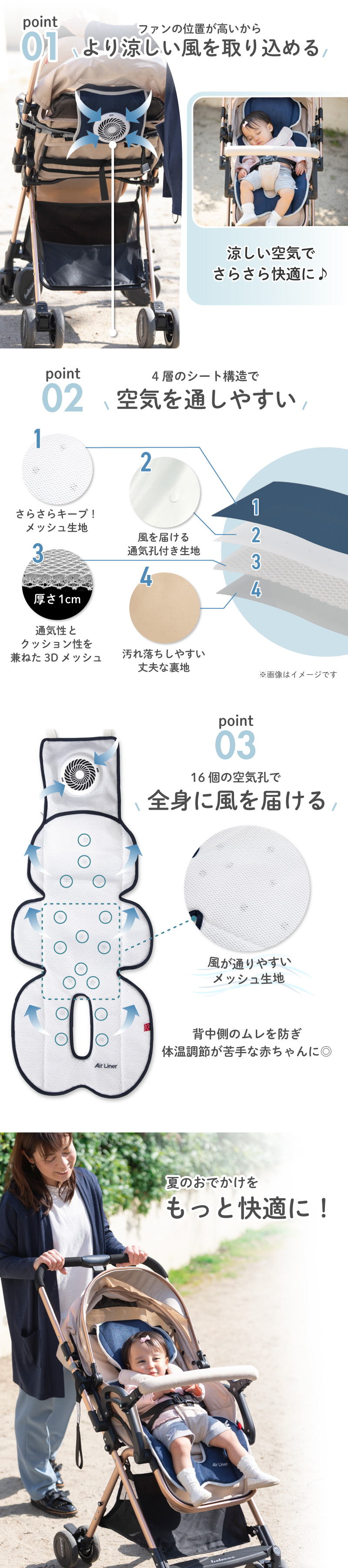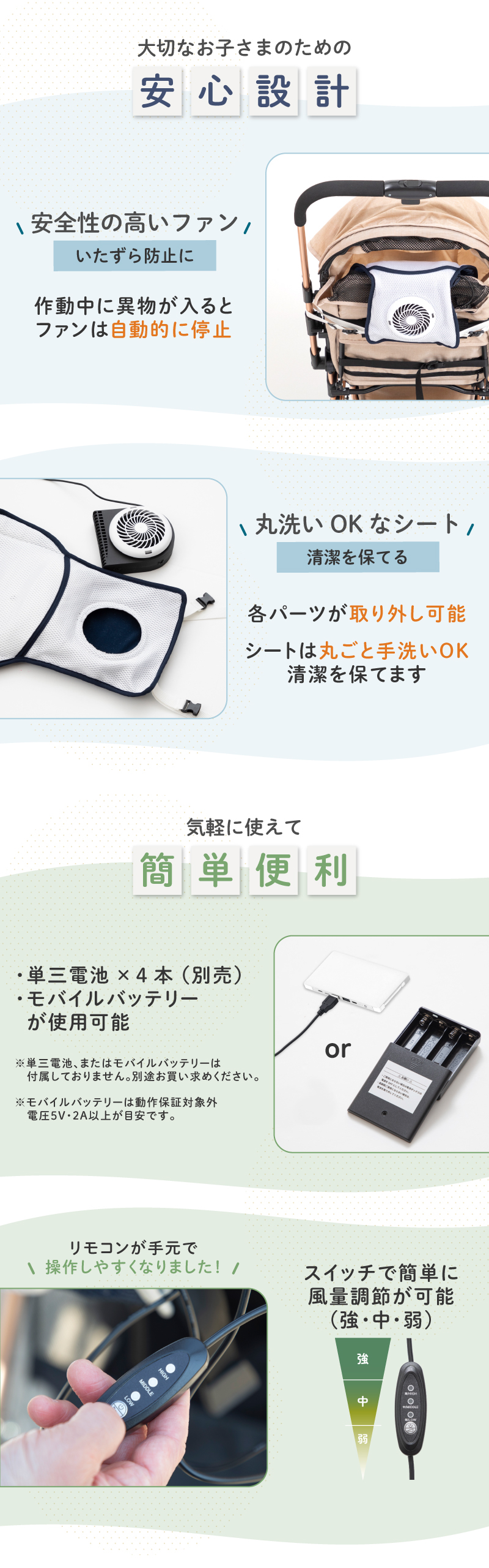 | ベビーカーでの暑さ・ムレを防ぐ!ひんやりベビーカーシートが新登場! 上部に付属させたファンから涼しい空気を取り込み、ベビーカーの乗り心地をさらさら快適に。 シートはまるごと手洗い可能で衛生面も◎ ファンは単三電池×4本で使用可能です! ※単三電池は付属しておりません。別途お買い求めください ※モバイルバッテリーでの使用は可能ですが、動作保証対象外となっております。また、モバイルバッテリーにより動かない場合がございます。 | |