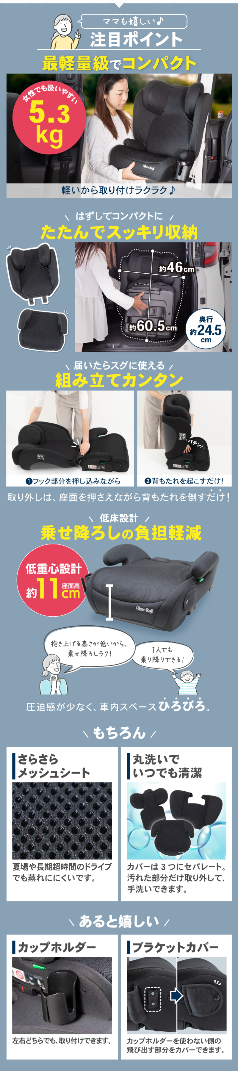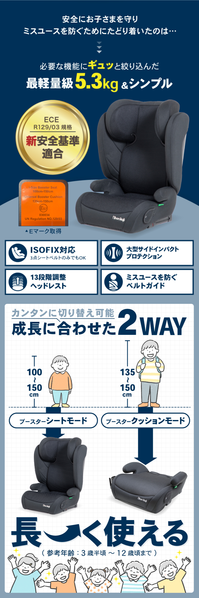 | 新安全基準ECE R129/03に適合 成長にあわせたシートモード&クッションモードの2WAYで長期間使える 身長100〜150cm これ1台でOK!(3歳半頃〜12歳頃) デュアルユース設計でISOFIX+3点式シートベルト⇔3点式シートベルトのみどちらも対応 ヘッドレストの高さ13段階、調整範囲約25cmでお子さまの体格にぴったりフィット 大型サイドインパクトプロテクションを採用 便利な着脱式カップホルダー1個付属 カバーは取り外して洗濯できます。 ※2026年1月13日に新モデルにリニューアルされ、座面のみで使用可能になりました。 ※2026年1月9日販売分までの旧モデルは座面のみではご使用いただけません。ご了承ください。 | |