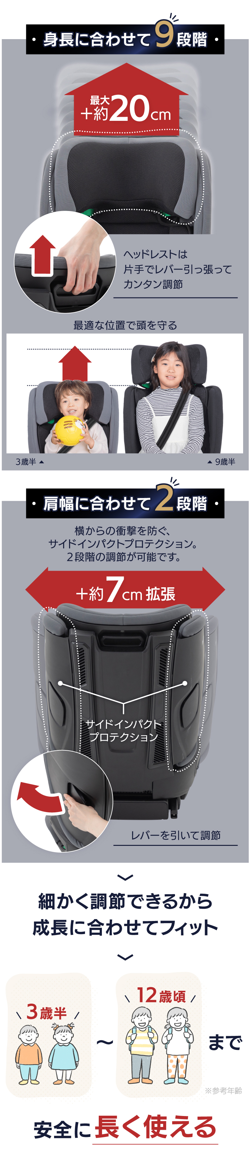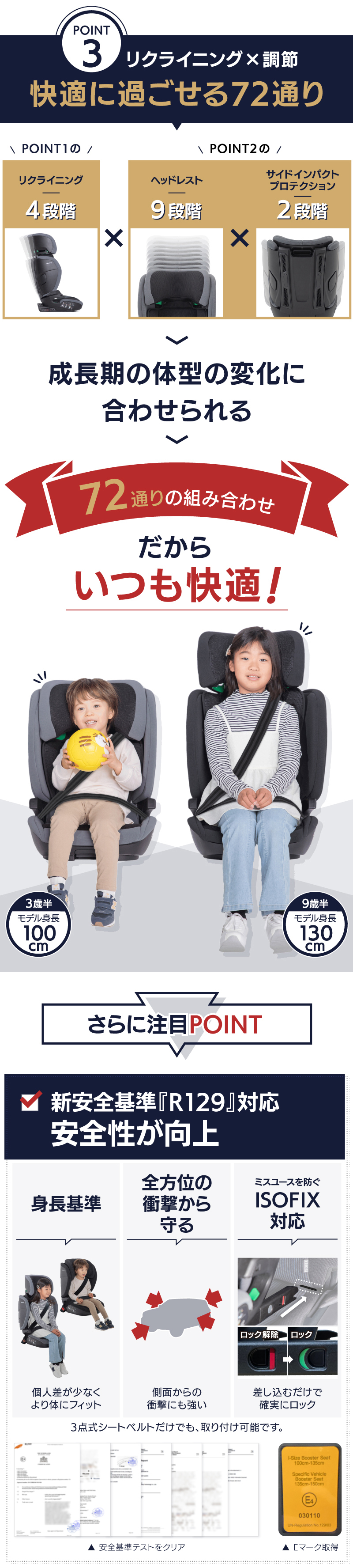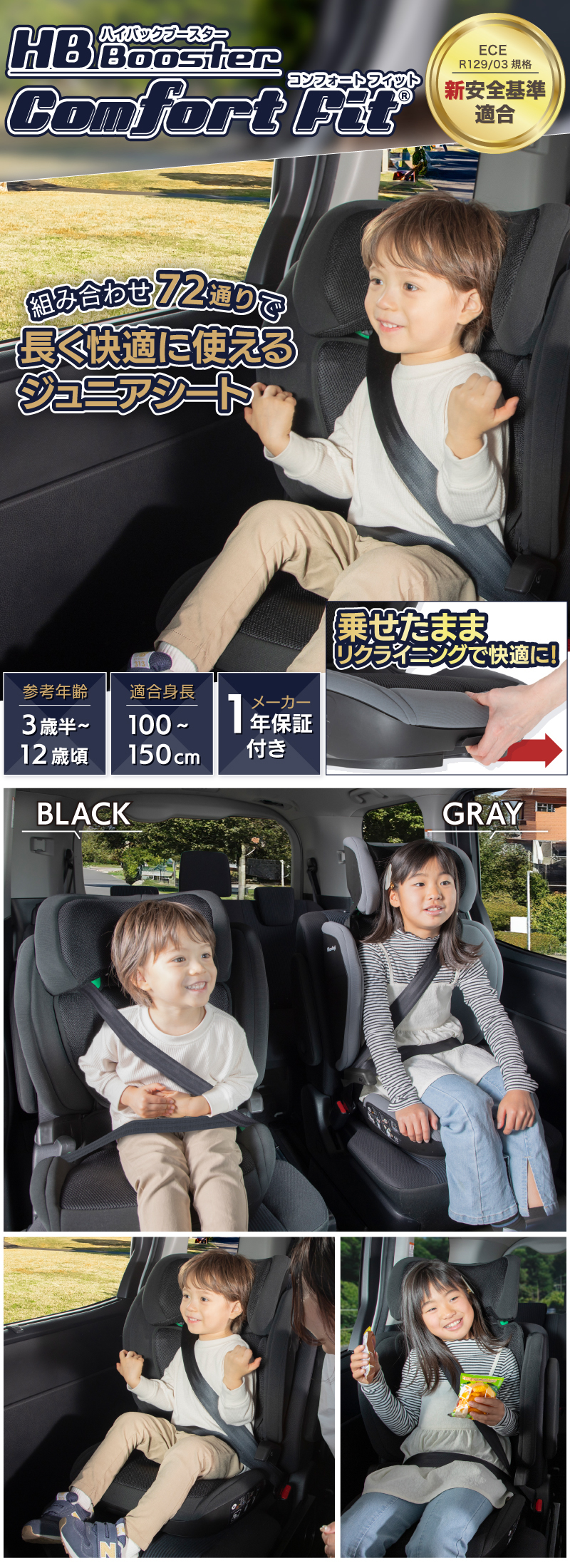 | 新安全基準ECE R129/03に適合 ロングユースジュニアシート! 身長100〜150cm これ1台でOK!(3歳半頃〜12歳頃) デュアルユース設計で3点式シートベルト⇔ISOFIXどちらも対応 座席の背もたれがリクライニングできなくても独自機構で4段階リクライニングを実現!眠ってしまっても快適 ヘッドレストの高さ9段階、調整範囲約20cm。サイド・インパクト・プロテクションの幅2段階、調整範囲約7cm(片側約3.5cm)でお子さまの体格にぴったりフィット 便利な着脱式カップフォルダー1個付属 カバーは取り外して選択できます | |