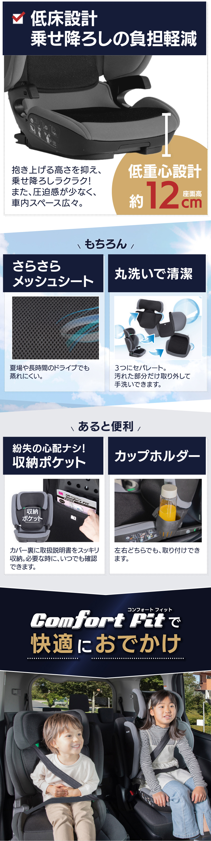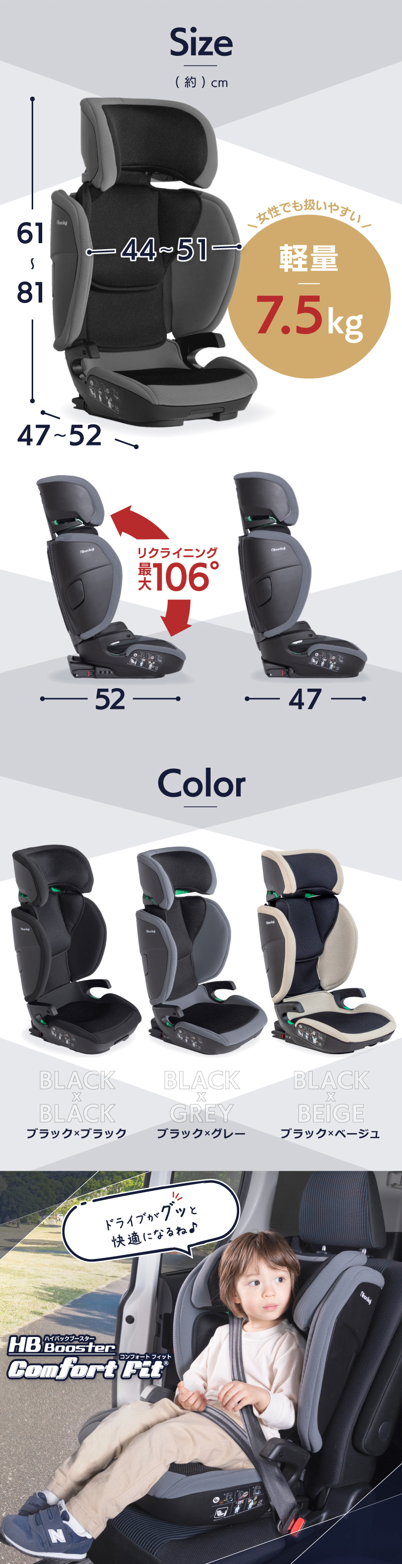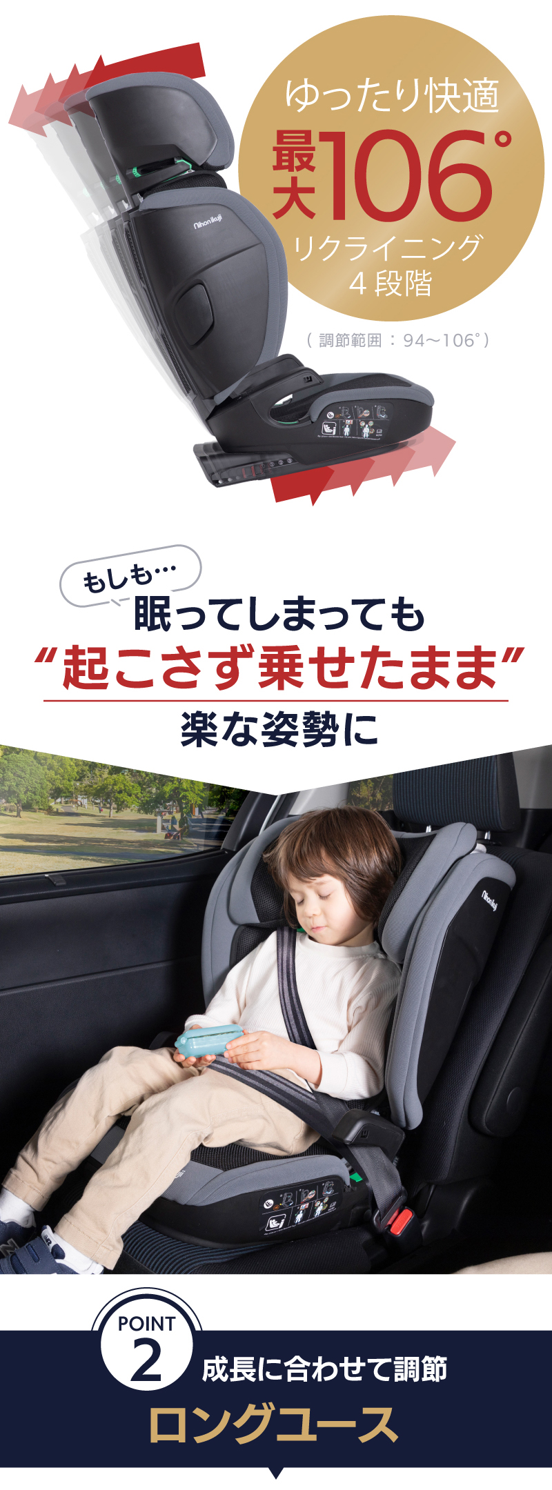 | 新安全基準ECE R129/03に適合 ロングユースジュニアシート! 身長100〜150cm これ1台でOK!(3歳半頃〜12歳頃) デュアルユース設計で3点式シートベルト⇔ISOFIXどちらも対応 座席の背もたれがリクライニングできなくても独自機構で4段階リクライニングを実現!眠ってしまっても快適 ヘッドレストの高さ9段階、調整範囲約20cm。サイド・インパクト・プロテクションの幅2段階、調整範囲約7cm(片側約3.5cm)でお子さまの体格にぴったりフィット 便利な着脱式カップフォルダー1個付属 カバーは取り外して選択できます | |