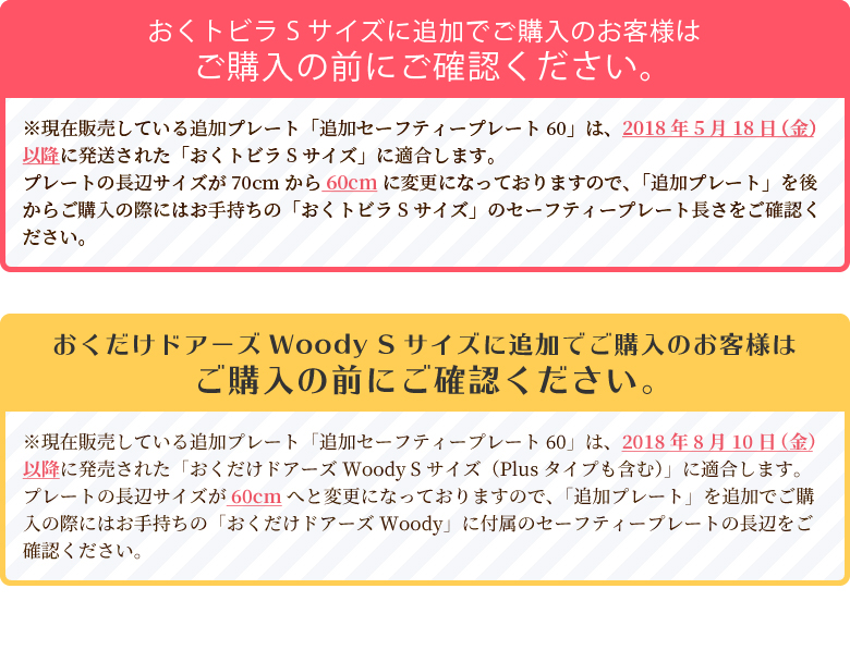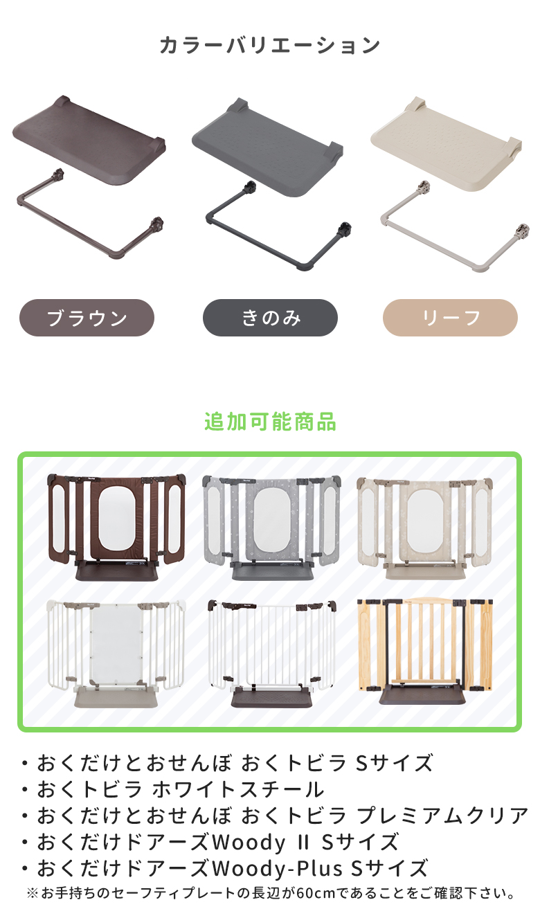 | 追加することでさらに安全性を高める セーフティープレート追加セット。 お子さまの体重をしっかり支えることができます。 ※購入前にお手持ちのおくトビラSサイズのプレート幅が 規格であることをご確認ください。 | |
