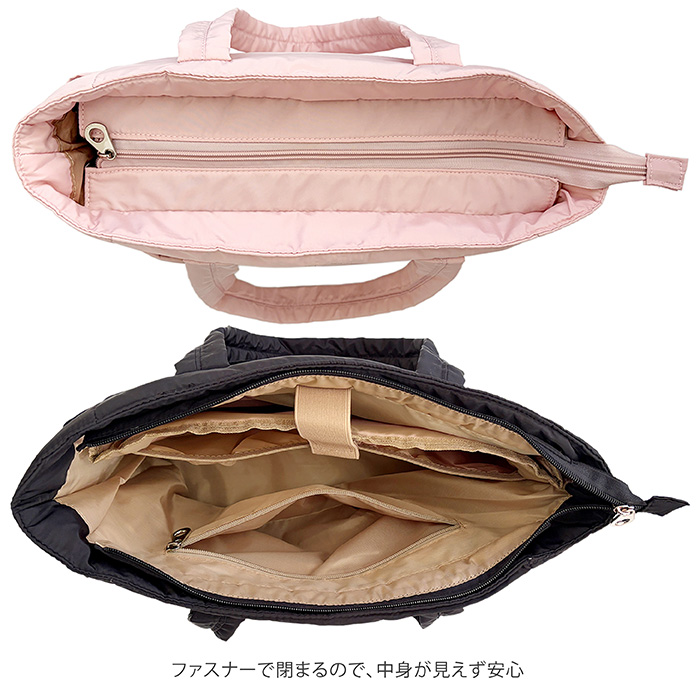 バッグ口にはファスナーが付いており、中身が見えないので安心です。