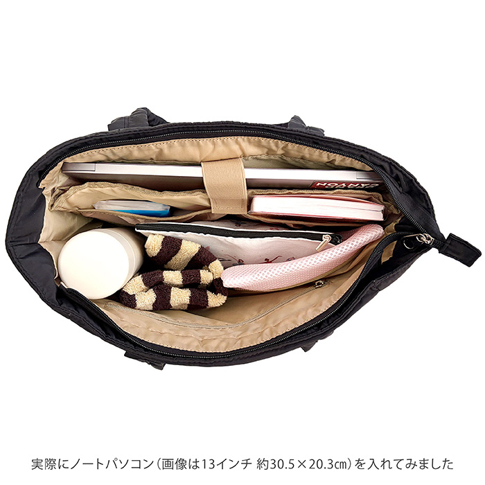 タブレットPCやノートパソコンを入れても固定できるので、バッグの中身と擦れる心配がありません。