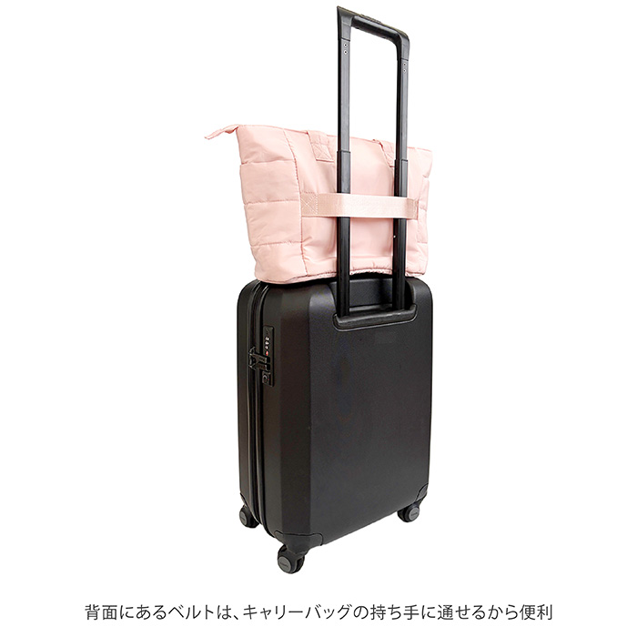 裏側には真一文字にベルトが縫い付けてあり、キャリーケースの持ち手に通すことができるので、旅行の際にストレスなくキャリーオンバッグとしてバッグのW持ちが可能です。
