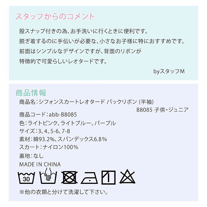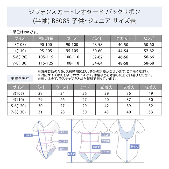 商品名:シフォンスカートレオタード バックリボン(半袖) B8085 子供・ジュニア