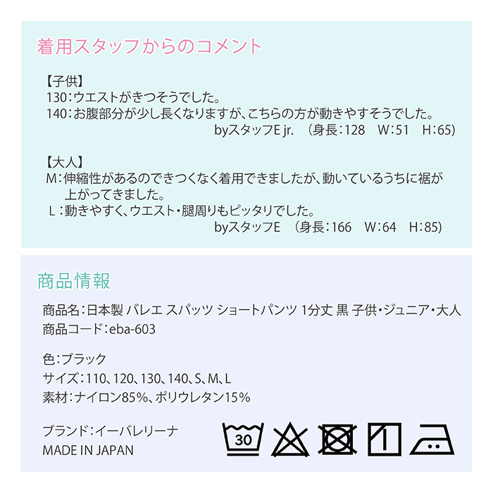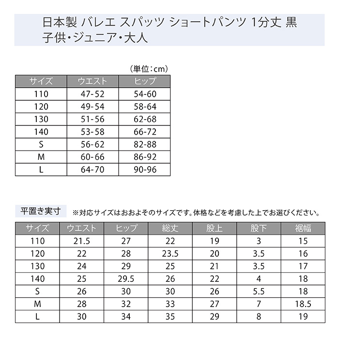 日本製 バレエ スパッツ ショートパンツ 1分丈 黒 子供・ジュニア・大人