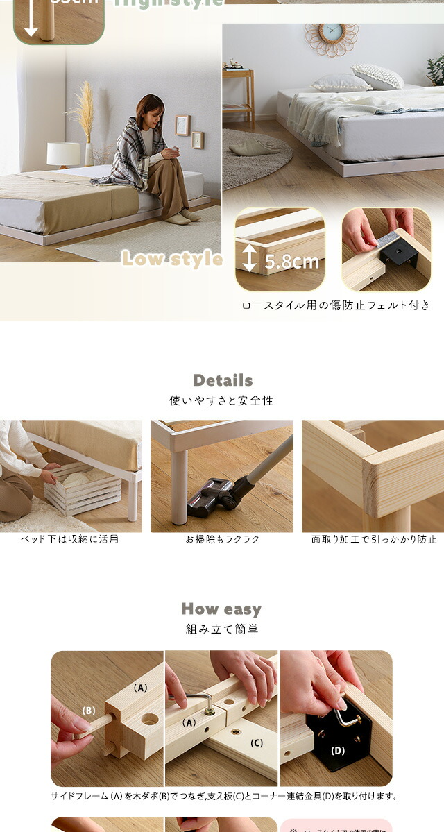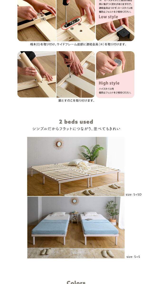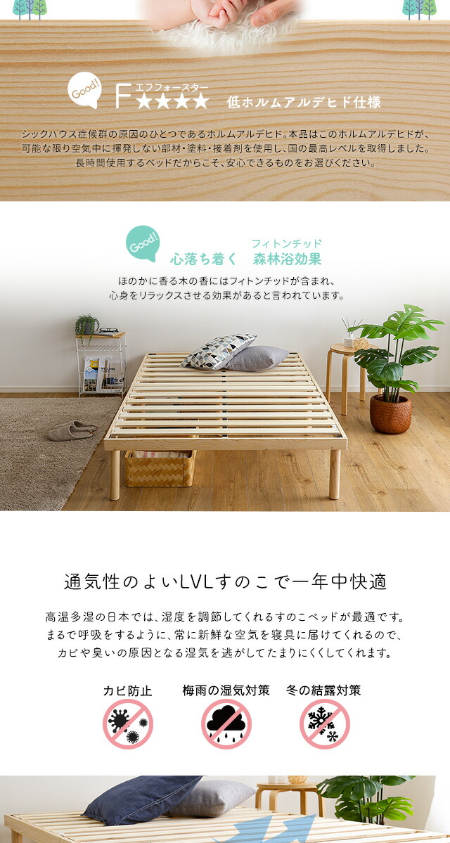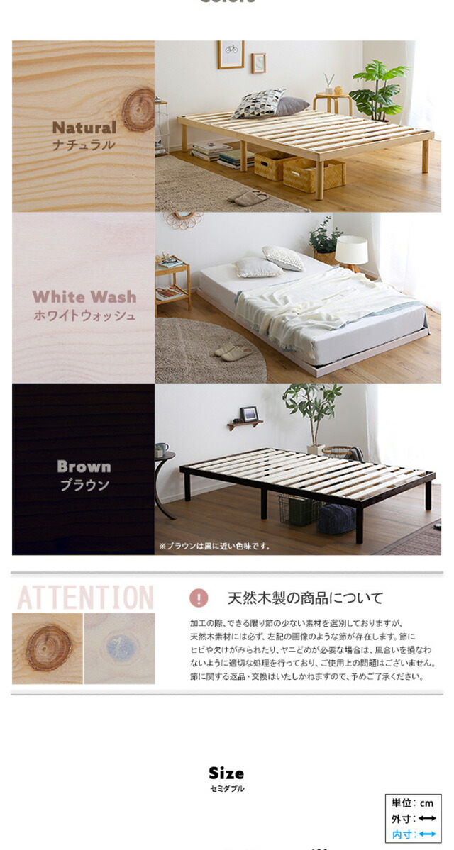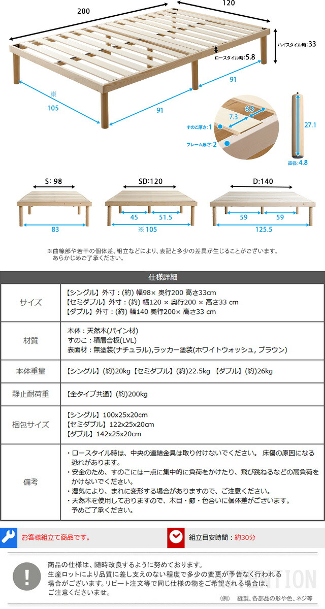 パイン材高さ2段階調整脚付きすのこベッド(セミダブル)