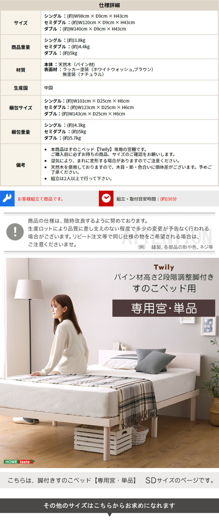 【宮単品】パイン材高さ2段階調整脚付きすのこベッド用(セミダブル)