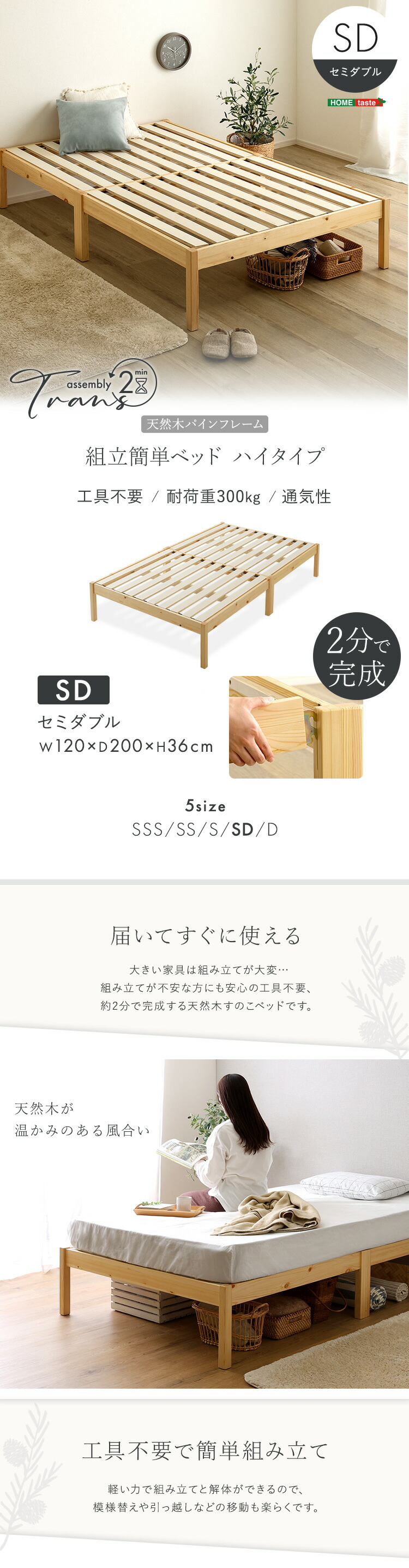 2分で完成!組立簡単ベッド ハイタイプ【Trans-トランズ-】(セミダブル)