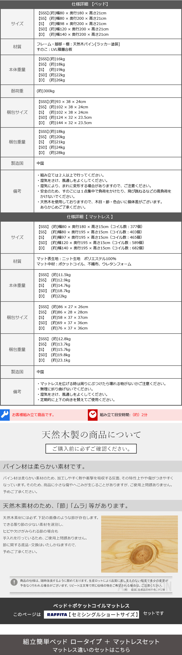 2分で完成!組立簡単ベッド ポケットコイルマットレスセット(セミシングルショート)