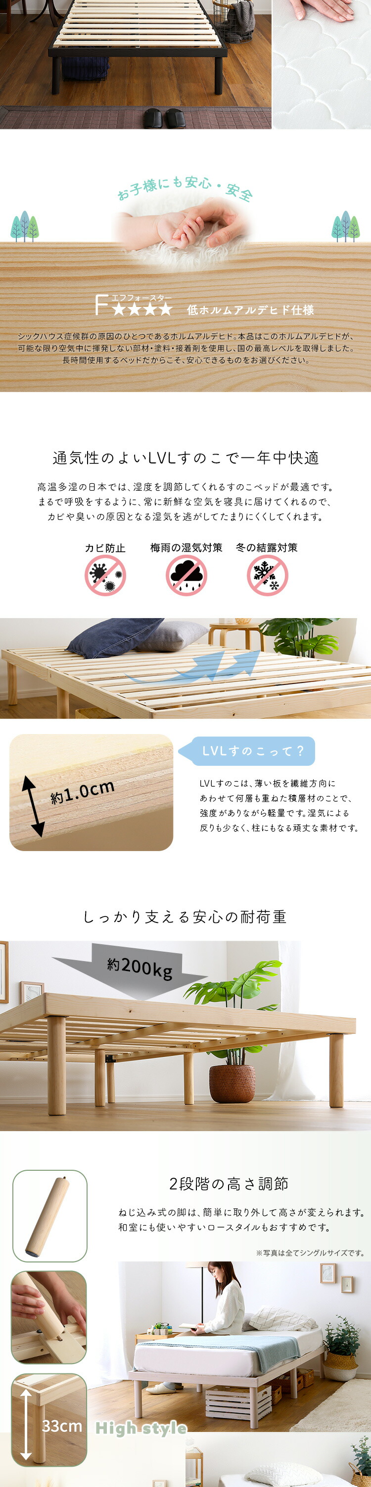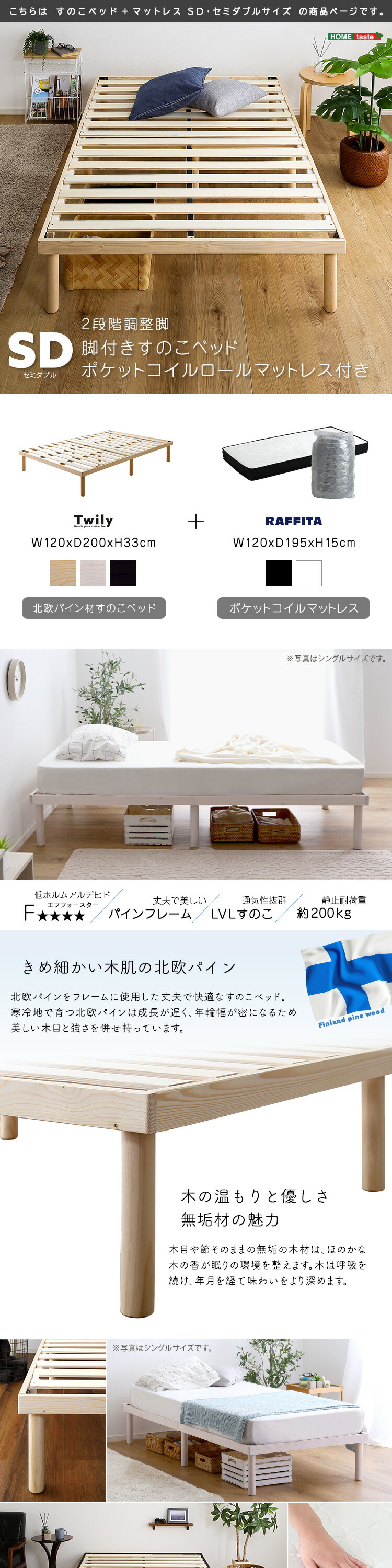 パイン材高さ2段階調整脚付きすのこベッド ポケットコイルマットレスセット(セミダブル)