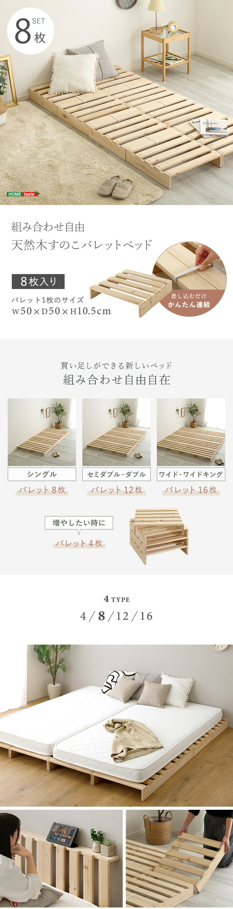 組み合わせ自由! 天然木 すのこパレットベッド 8枚入り