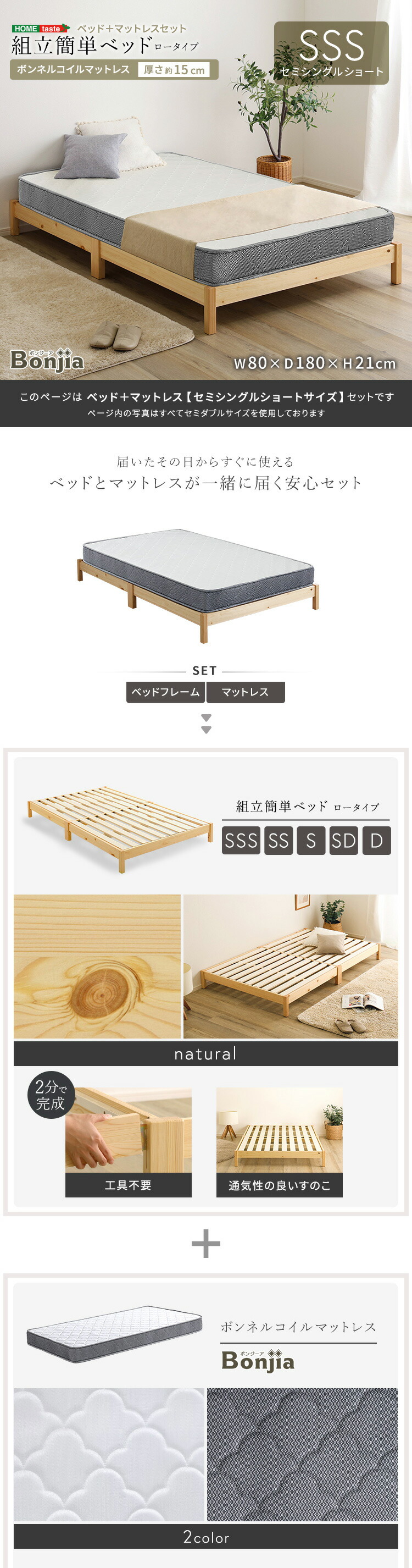2分で完成!組立簡単ベッド ボンネルコイルマットレスセット(セミシングルショート)