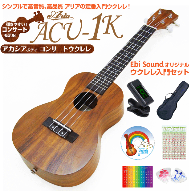 アカシアの、1本1本異なる表情豊かで味わい深い木目と明るくクッキリした音色は、まさにハワイアン・コアといった雰囲気。ウクレレソロ向きな大きなボディと長いネックのコンサートウクレレは、ソプラノでは小さいと感じるかたにもおすすめです。音色もルックスもハワイの気分満点、ワンランク上の入門ウクレレ『ACU-1K』。コストパフォーマンス抜群、EbiSoundが自信を持ってお勧めする、良質でお手軽なベストウクレレです!