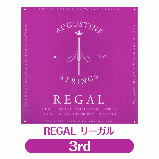 オーガスチンのリーガル弦の3弦単線販売です。リーガルは、音色、ピッチの安定度、耐久性、音量と、あらゆる面で最高のクオリティを目指して作られた高音弦です。