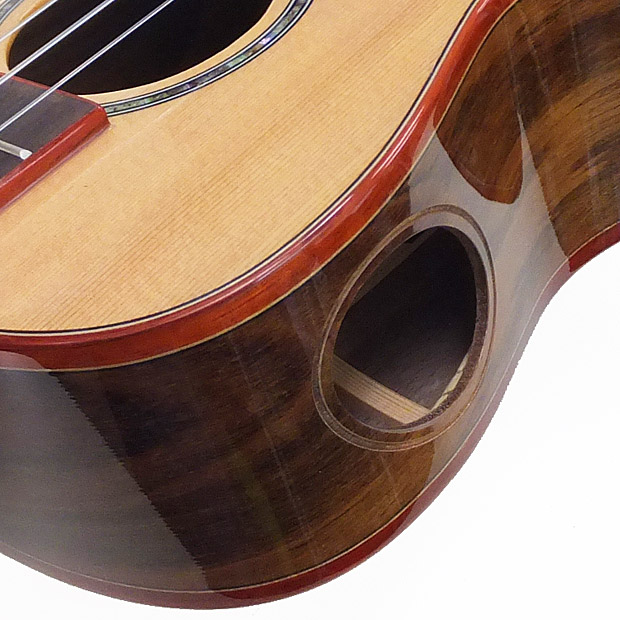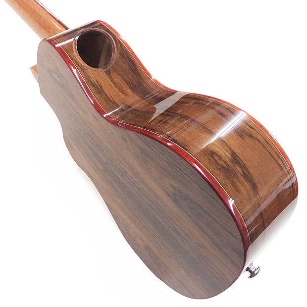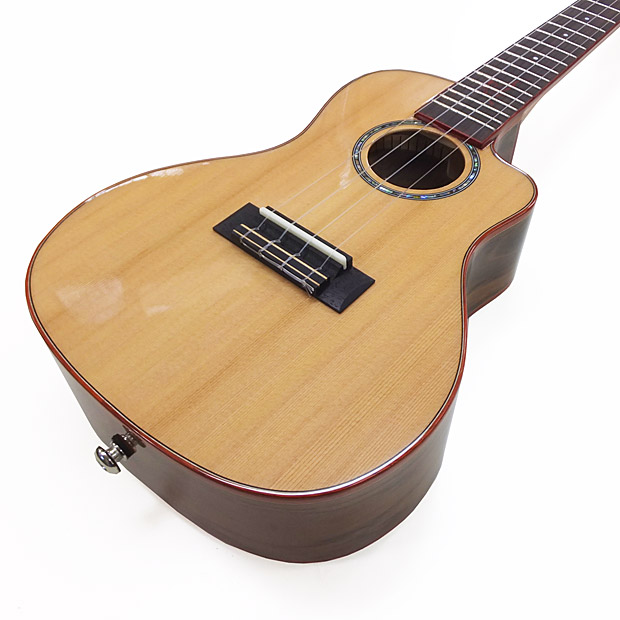 | Kaiの700シリーズは、クラシックギターのトップ材のシダー(セダー/杉)単板をトップ材に採用したモデルです。シダーやスプルースなどの針葉樹は弦楽器に最適な振動特性を持つ歴史あるトーンウッドで、ピッキングへの反応の良さと音の立ち上がりは、マホガニーやコアを凌ぎます。音量も豊かで適度な音色の暖かみも備えたシダーの特徴に、フロロカーボン弦の艶とサスティーンがマッチすることで、とにかく弾いていて気持ちの良いサウンドになっています。 KC-700Cは様々な演奏スタイルに対応するコンサートサイズ。指板のハイポジション部分のボディをカットした「カッタウェイ」仕様で、高音を駆使するソロプレイで本領発揮してくれます。美しいオールグロスフィニッシュのボディに巻かれた赤みの強いバドゥーク材がよいアイキャッチになっています。 弦を爪弾くと、立ち上がりの良い音色がふたつのサウンドホールから飛び出してきます。とくに側面のモニターサウンドホールの音色は一度体験すると他のウクレレが物足りなく感じるかもしれません! ウクレレをしっかりと保護するロゴ入りオリジナルバッグが付いていますので、どこへでも安心して連れ出すことができます。 |