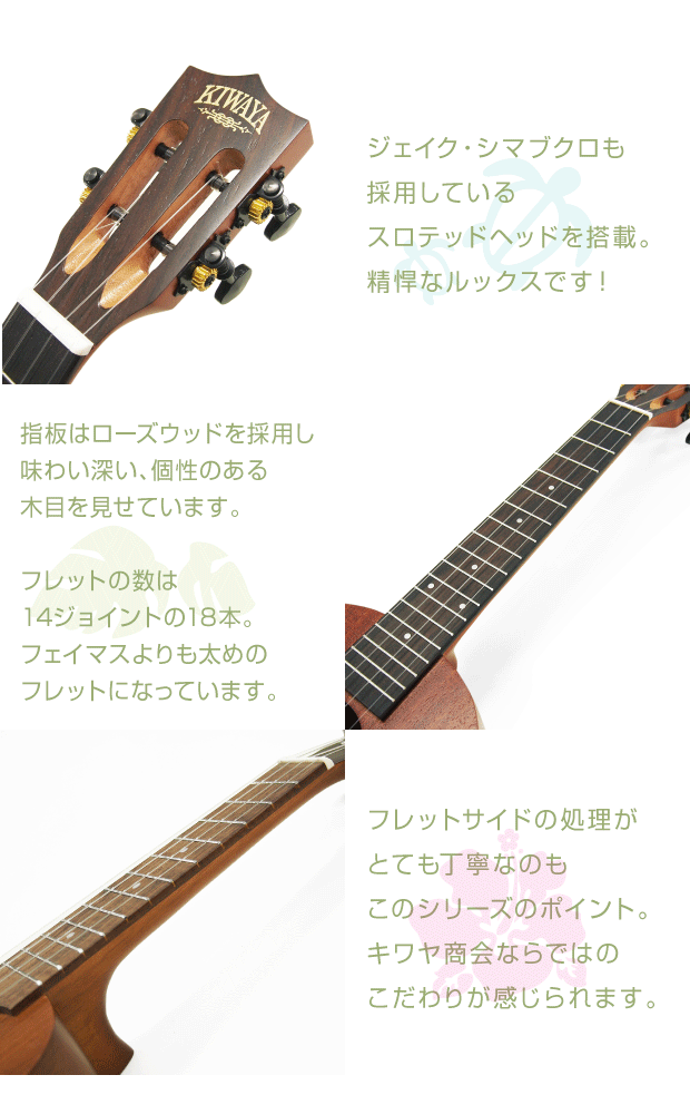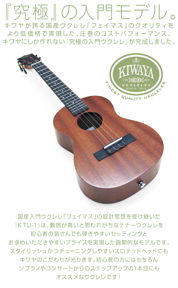 | 日本が世界に誇るウクレレブランド「フェイマス」で知られるキワヤ商会による、初心者向けの海外製低価格シリーズ『KIWAYA UKULELES』。国産のフェイマスウクレレクオリティをより低価格で、多くの方に楽しんでもらいたい。『KIWAYA UKULELES』シリーズには、日本のウクレレ界をリードするキワヤ商会のそんな思いが込められています。 『KTU-1』はウクレレプレイヤーの憧れ、テナーサイズのウクレレです。サイズが大きく弦のテンションも強いですが、表現力豊かで音量もありピッチ精度も高いテナーは、プロのプレイヤーに愛用者が多いサイズ。KTU-1はお手頃価格で高性能だから、ビギナーのみなさんにもオススメです! フェイマスウクレレに匹敵する美しい音色と丁寧な仕上がりを、海外製ながら高いレベルで実現しているKIWAYA UKULELES。当店が皆さまに一番にご紹介したい決定版ウクレレです。 【ウクレレの色味・木目につきまして】画像は全て参考画像です。実際のウクレレは画像よりも色の濃淡や色味に一定の範囲で差違がございます。また、木目は個体毎に異なります。色味や木目の差違による交換・返品は承っておりません。予めご了承の上お買い求め下さいますよう、お願い申し上げます。 当店では、プレゼント包装は承っておりません。予めご了承くださいますようお願いいたします。 |