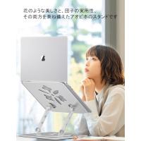 ・1、【安定性優越&滑り止め&更に創造的なデザイン】弊社の本ノートパソコンスタンドは高品質な6系6061のアルミニウム合金素材を使用して特別のクラフトで製造し、複雑のアノード酸化されました。製品の表面にはとても繊?なアノード酸化顆粒をついて、良い肌触りです。本体が超耐用の上に頑丈で、底部に四つの滑り止めラバーをつけ、接触面にも二つの保護用ゴムがあり、二つの花弁を重ねて形成されたデザインのゆえに透かし部分が手の届かない花になるので高嶺の花と呼びます。たま調整道具を付属したので、ノートパソコンはスタンドに載せて振動せずに作業でき、安定性は抜群です。