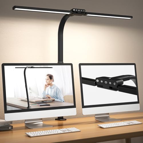 ・【広幅双頭デザイン】この強力なLEDクランプ式デスクライトは、77cmの超広幅デュアルライトバーを採用し、最大高さ77cm、最大輝度1800ルーメンで、広いデスク全体を照らすことができます。広いデスクでの作業、勉強、絵画、モニター、読書、ゲームなどの照明に適しています。