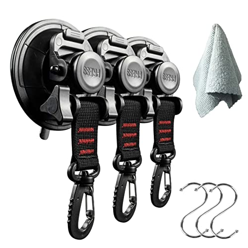 【強力真空吸盤フックセット】セット内容:吸盤フック3個、S字フック3個、タオル1枚。360度回転しロック式の自由度の高いフックです。使用前に付属のタオルでガラスを拭くことができます。車のサイドテントやサンシェードの固定に使う場合は取付穴の種類によってS字フックを選択することができます。吸盤素材:PVC+ABS・サイズ:直径9cm*厚さ4cm・耐荷重:静止状態で30kg