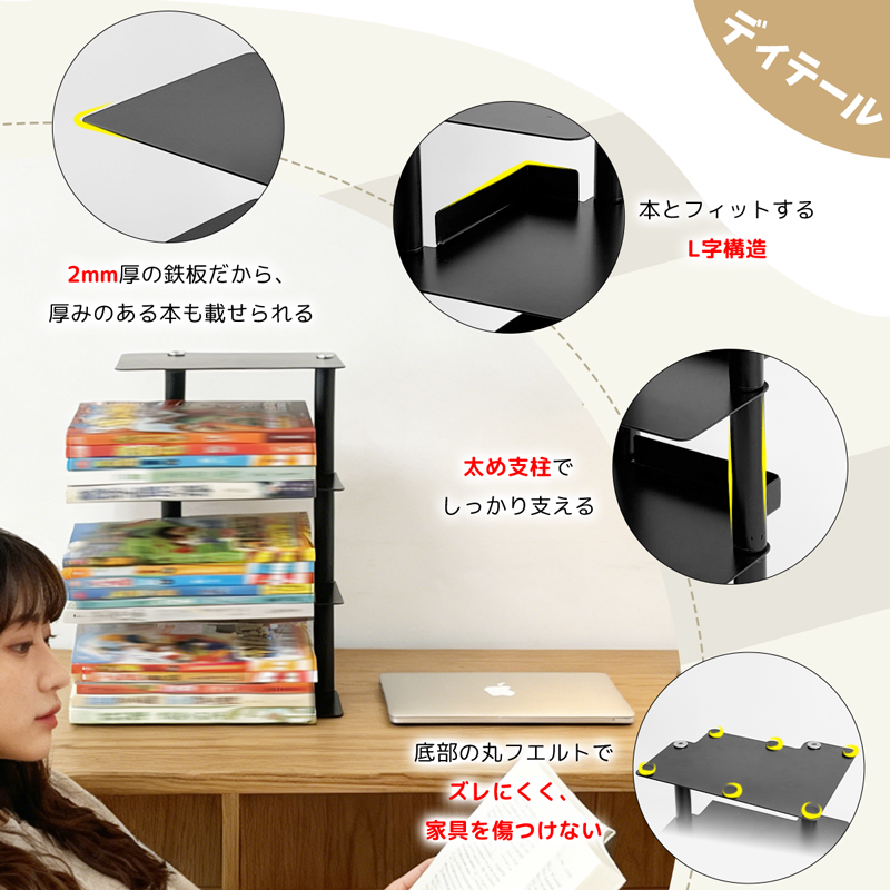 丈夫なスチール素材を採用し、本を重ねても安定感抜群。