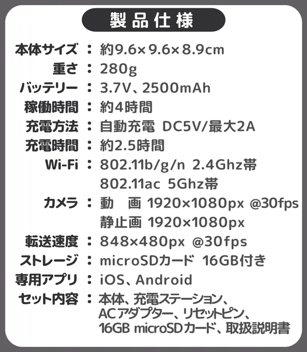 ▼<用途・シーン>防犯 防犯カメラ ペット見守り 子供 おもちゃ ペット 一人暮らし 小型カメラ 固定式カメラ 可動式カメラ 自動充電 落下防止 猫用おもちゃ 犬用おもちゃ アラーム 自動撮影 録画 画像編集 画像共有 アクセス トランシーバー 赤外線センサー 暗視モード パトロール 留守 外出 出張 顔認識 インテリジェント 追跡 人間 障害物回避 Wi-Fi 5G コミュニケーション 遊び相手 見守りロボット ロボット AI リアルタイム 監視 セキュリティ モバイル通信 マルチユーザー ネットワーク センサー 高画質 専用アプリ SDカード メモリ 自動保存 フルHDカメラ 養護施設 老人ホーム▼<対象>子供 幼稚園児 小学生 10代 20代 30代 40代 50代 60代 70代 80代 男性 女性 父 母 娘 息子 姉 妹 兄 弟 嫁 妻 夫 祖母 祖父 彼女 彼氏 恋人 親子 パートナー 自分 家族 社会人 親 両親 高齢者 ▼<商品カテゴリ>セキュリティカメラ 防犯カメラ スマートホームカメラ スマート家電 犬用品 猫用品 ペット用品 室内用防犯カメラ ペット用家電▼<商品イメージ>スマート 可愛い 高性能 賢い コンパクト 小型 丸い ボール型