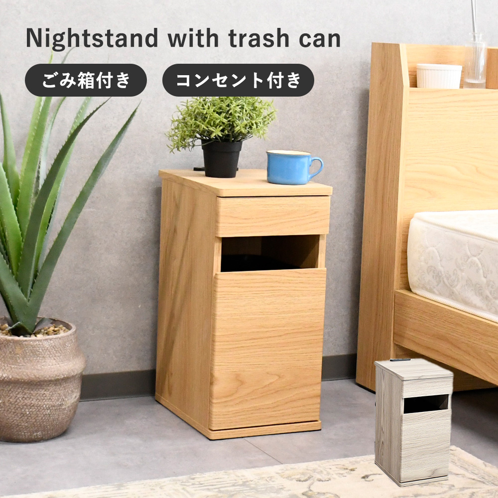 ナイトテーブル シンプル 完成品 ゴミ箱付き シンプル 木製 コンセント付き サイドテーブル おしゃれ 収納棚 コンパクト ミニテーブル ゴミ箱 スリム