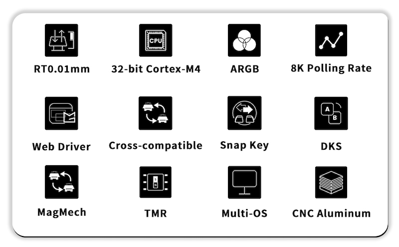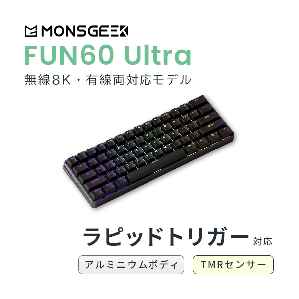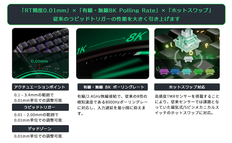 主な特徴 : カスタムアクチュエーション/Mod-Tap/トグルキー/ダイナミックキーストローク/キーリマッピング/カスタマイズ可能なRGB/SOCD