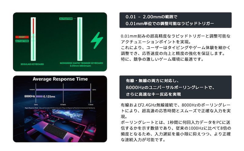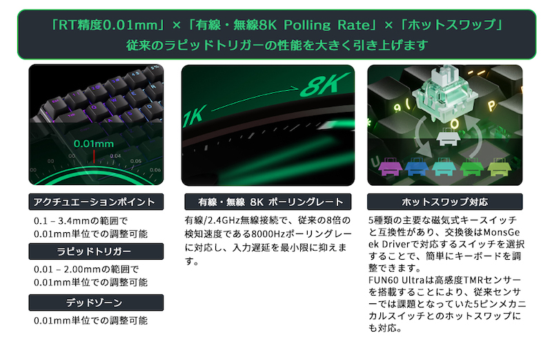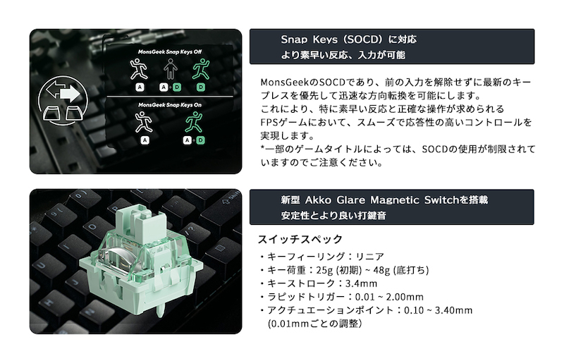 モンスギーク テンキーレス ラピトリ ポーリングレート 8000Hz 8K Akko Glare Magnetic Switch Snap Keys SOCD ダイナミックキーストローク DKS モッドタップ Webドライバー 国内正規品 Arm Cortex-M4 CPU 60% Mac Macintosh Windows VALORANT ヴァロラント