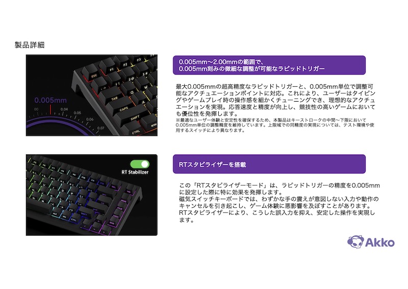 | FUN60の性能を超える、テンキーレスサイズキーボード ■ 英語配列 75%テンキーレスサイズ ■ ラピッドトリガー : 0.005mm〜2.00mm ■ カスタマイズ可能な作動距離 : 0.1mm〜3.4mm ■ RTスタビライザーを搭載 ■ 8000Hzポーリングレートと16000Hzユニバーサルスキャンレート ■ Akko AstroAim Magnetic Switchを搭載 ■ 主流の磁気スイッチとのホットスワップに対応 ■ ARGBバックライト ■ Cherryプロファイル PBT サイドプリント キーキャップ ■ 有線接続 ■ ラピッドトリガーキーボードの基本機能 : Snap Key(SOCD)/ダイナミックキーストローク(DKS)/モッドタップ/トグルキー(TGL) ■ ソフトウェア/Webドライバーで様々な設定が可能 ■ Windows/Mac 両対応 ※最適なユーザー体験と安定性を確保するため、本製品はキーストロークの中間〜下限において0.005mm単位の調整精度を維持しています。上限域での同精度の実現については、テスト環境や使用するスイッチにより異なります。 [メーカー]アッコ Akko[商品型番] AKKO01-00015-WH[バーコード] 6978414650378 |