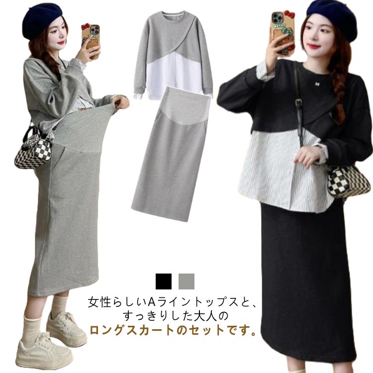 | 女性らしいAライントップスと、すっきりした大人のロングスカートのセットです。 ナチュラルな光沢のあるジャージー生地を使い、楽な着心地なのにスタイリッシュで洗練された雰囲気のマタニティースカート 1枚でこなれ感のあるセットアップ風スタイルが完成。 普段使いはもちろん、通勤やちょっとしたお出かけにも使える上品ワンピースです。 トップス部分をめくって授乳するタイプなので、産後は授乳服だと気づかれにくいのが嬉しいポイント。 | |