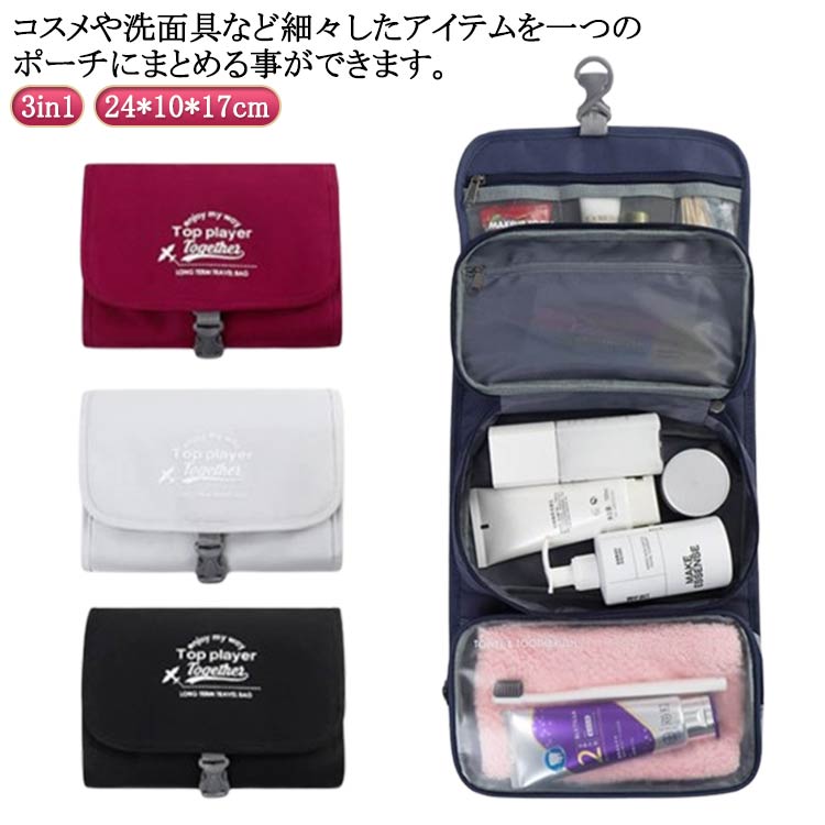 コスメや洗面具など細々したアイテムを一つのポーチにまとめる事ができます。 吊り下げ用のフックが付属しており、壁に掛けての使用が可能です。 男女兼用で、使い勝手の良いデザインです。 旅行やジム、キャンプ、出張など、様々なシーンで幅広く使用できます。 | |