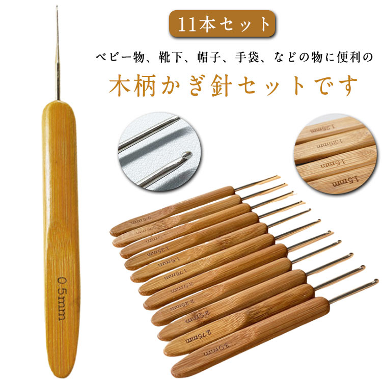 | 【11本セット】 ベビー物、靴下、帽子、手袋、などの物に便利の木柄かぎ針セットです。 針先から糸がかけやすくて、糸を引き抜きやすい針先形状です。 編み針のハンドルに数値表記が付いて、手持ちの糸に合わせて使い分けができます。 天然竹柄の表面は滑らかで、持ちやすく、長時間の使用でも疲れません。 小さく軽量で、財布やポケットに入れて持ち運びが簡単になります。 | |
